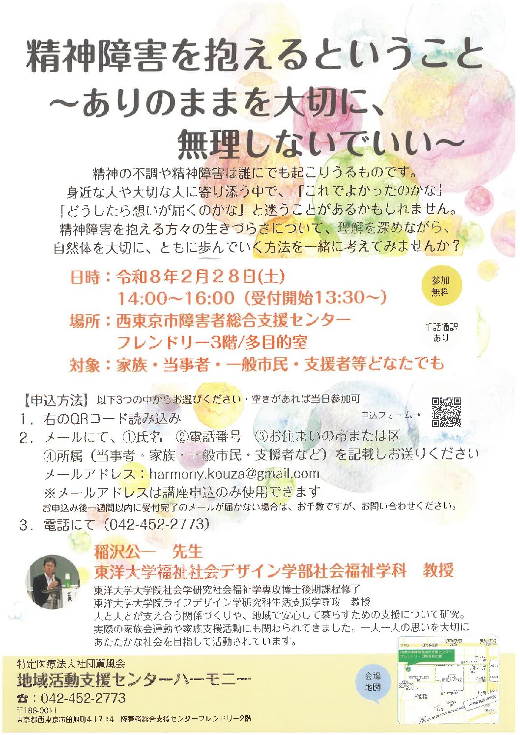 西東京市にある地域活動支援センターハーモニーより、市民向け講演会のご案内がありましたのでお知らせいたします。精神障害を抱える方々の生きづらさについて理解を深め、ともに歩んでいく方法を考える機会として、東洋大学の教授を講師に実施されるものです。他市の取組ではありますが、ぜひ関心のある方はご参加ください。