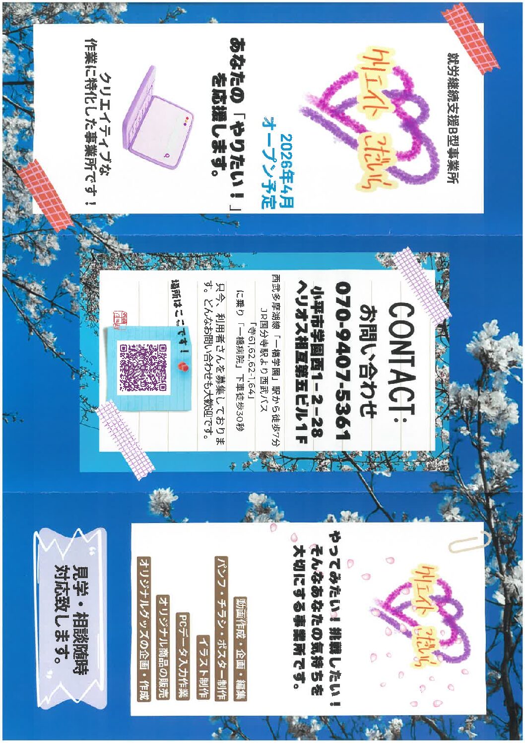 小平市に令和8年4月に新規開設する就労継続支援B型事業所「クリエイトこだいら」から情報提供がありましたのでお知らせいたします。