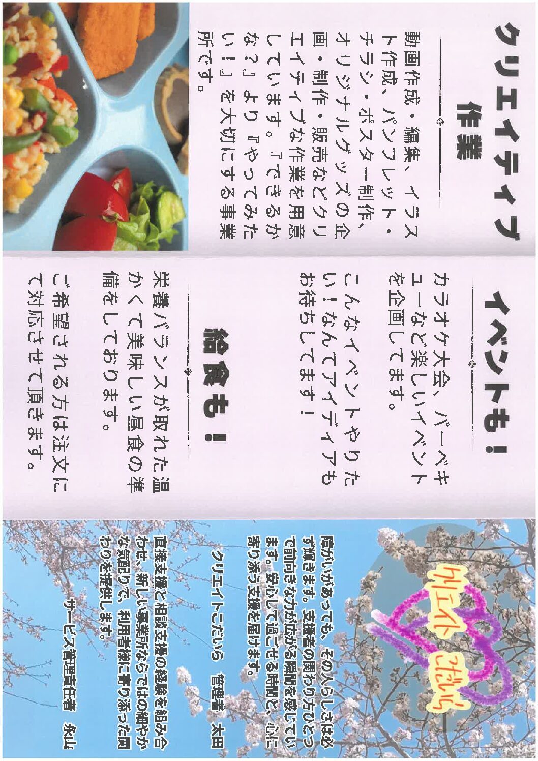 デザイン、イラスト製作、動画編集等、PCを用いた専門性の高い作業機会の提供をしています。また実際の制作案件を受注する実践的な支援も行ってまいります。PC作業が好きな方、クリエイティブな分野に興味がある方がいらっしゃいましたら、ぜひ情報提供の一助としていただけますと幸いです。