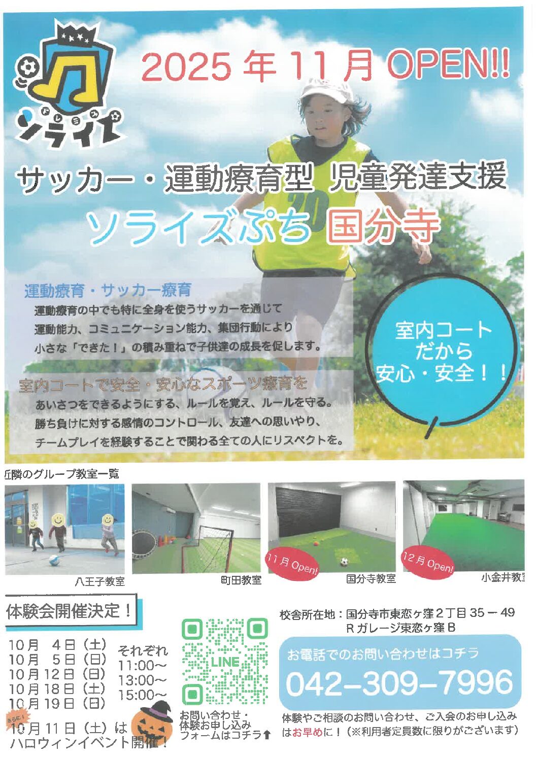 児童発達支援「ソライズぷち国分寺」は東恋ヶ窪で11月オープン、放課後等デイサービス「ドレミファソライズFC小金井」は小金井市本町で12月オープン予定です(定員はいずれも10名)。