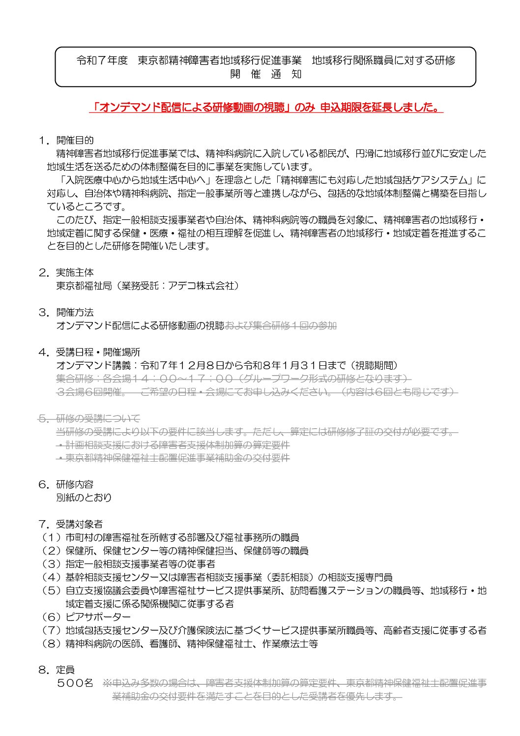 地域移行関係職員に対する研修の開催について 2025.12.25 トップページ › forums › 相談支援専門員向け情報共有フォーラム › 地域移行関係職員に対する研修の開催について このトピックには0件の返信、1人の参加者があり、最後にとわぷるにより5日、 22時間前に更新されました。 1件の投稿を表示中 - 1 - 1件目 (全1件中) 投稿者 投稿 2025年12月25日 1:05 PM #6093 とわぷるキーマスター 相談支援事業所のみなさま いつもお世話になっております。 令和7年度精神障害者地域移行促進事業 地域移行関係職員に対する研修の開催についてのお知らせです。 すでに申込・受講されている方もいらっしゃるかと思いますが、「オンデマンド配信による研修動画の視聴」のみ申込期限が延長(令和8年1月23日〆切)となりましたのでお知らせいたします。 オンデマンド配信は令和8年1月31日までとなります。 詳細につきましては別添のチラシをご確認ください。 どうぞよろしくお願いいたします。 Attachments:f4e5f643c676757febce9a8e63264681.pdf 投稿者 投稿 1件の投稿を表示中 - 1 - 1件目 (全1件中) このトピックに返信するにはログインが必要です。 ログイン ユーザー名: パスワード: ログイン状態を保持 ログイン